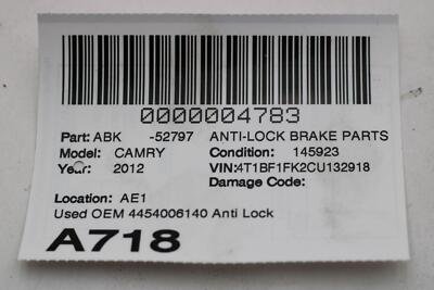 Be the first to review “2012 TOYOTA CAMRY Anti-lock Brake Parts ABS Unit OEM 4454006140”